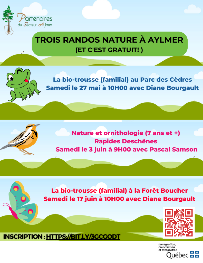 Que diriez-vous de profiter de ces moments ensoleillés pour des randonnées en famille tout en bénéficiant de partages enrichissants ? Les Partenaires du secteur Aylmer (PSA) organisent plusieurs rencontres en français au cours des prochaines semaines et c’est gratuit.