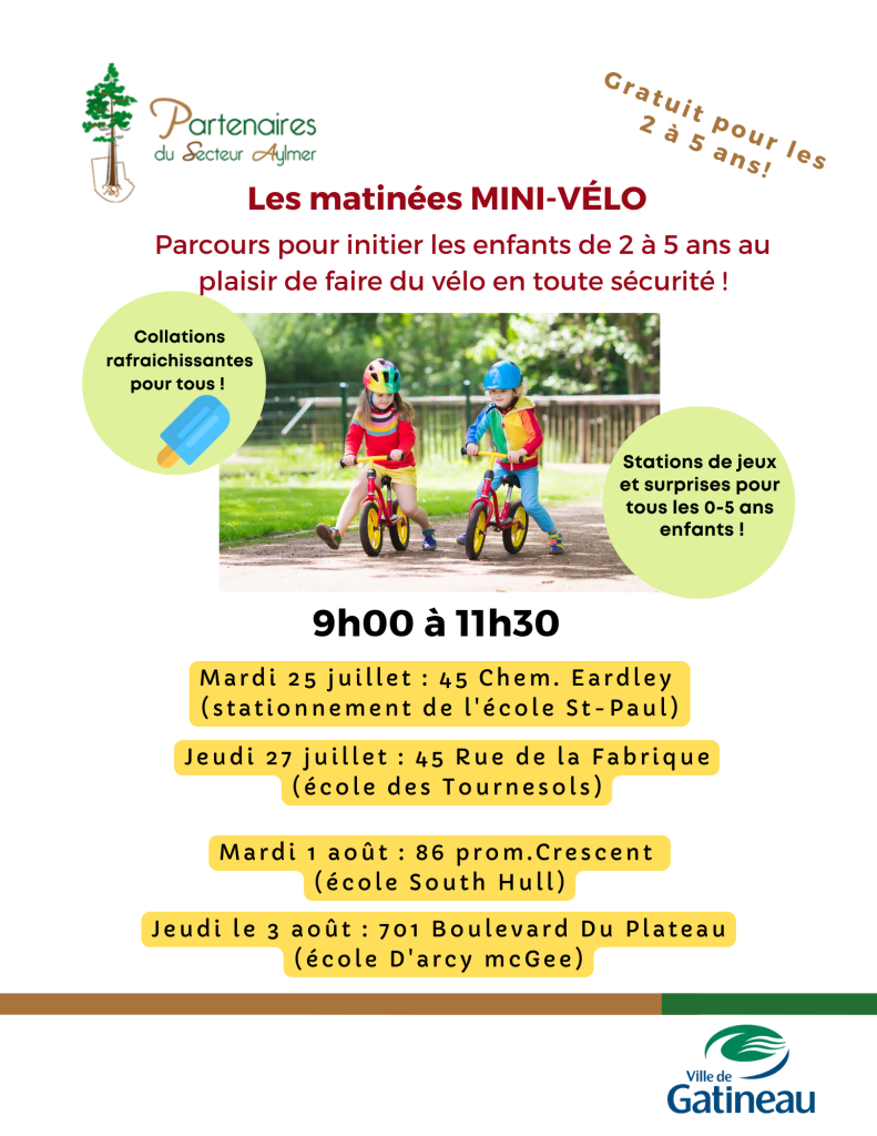 Vous voulez permettre à vos enfants de 2 à 5 ans de pratiquer à du vélo sur un parcours sécuritaire, de pratiquer leur équilibre ou leur apprendre à pédaler pour la toute première fois? Si oui, venez nous voir lors d’une des matinées près de chez vous. Bref, l’objectif est de découvrir le plaisir de faire du vélo le plus tôt possible dans la vie d’un enfant!